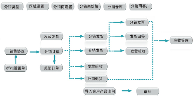 ●處理分銷訂單、分銷發(fā)貨/退貨、發(fā)貨回簽、發(fā)貨驗收、轉(zhuǎn)應收等