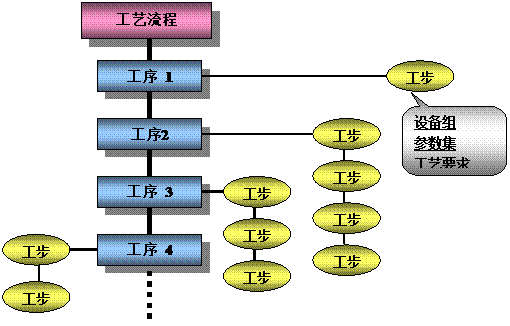 該模塊可擴展現行的MES系統產品定義能力.并且它與工程數據采集模塊相集成,以支持系統中工藝規范管理和工程數據采集的要求(見下圖).以下是工藝流程模塊的主要功能: