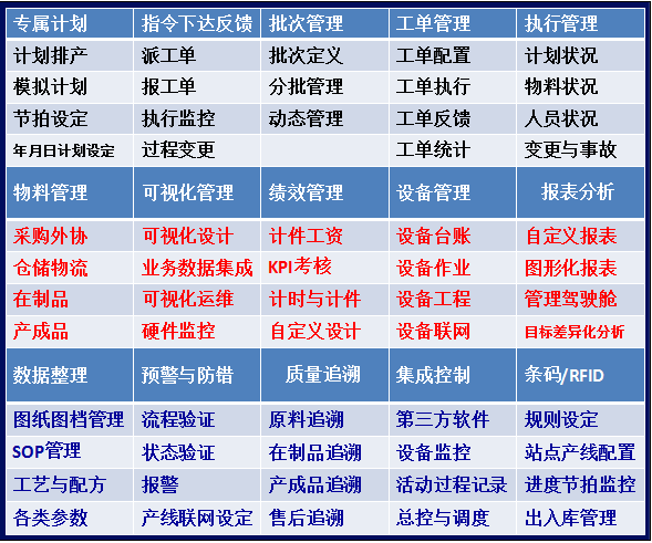 上圖可見,能夠實現MES系統的還有一個前提就是能夠和多種的系統進行集成。所以說采集、分析、集成、控制、敏捷是MES的特點。涵湛MES通過多家實踐總結,好的MES系統只要適應這家企業的應用、滿足企業的信息化需求、有著長遠目標和規劃的系統就是一套好的系統。MES系統是沒有固定的標準的軟件,都是通過詳細的規劃和系統的配置才能夠實現。涵湛軟件公司也是通過系統的平臺給每家客戶進行專屬的配置。那么就是要靈活、快速、便捷的應用各相應的模塊。這些模塊包含:
