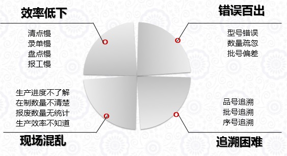 3、現(xiàn)場混亂-生產(chǎn)進度不了解、在制數(shù)量不清楚、報廢數(shù)量無統(tǒng)計、生產(chǎn)效率不知道