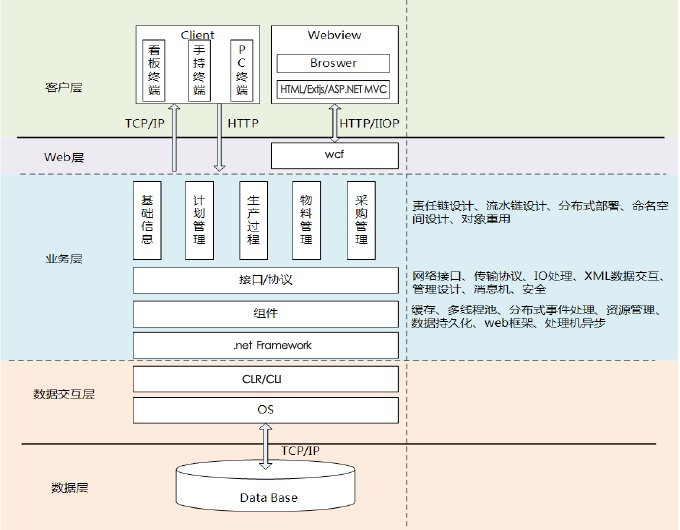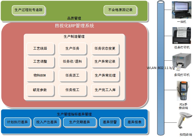 項目由4大核心模塊構成:基礎資料模塊、業務功能(生產計劃管理、采購管理、倉儲物流管理展、生產過程管理)模塊、數據采集模塊、查詢報表及可視化展示模塊。