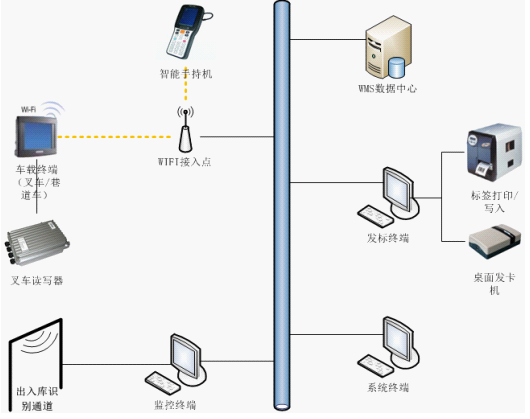 根據涵湛軟件WMS的RFID管理需求,目標系統將由智能RFID手持機系統、智能RFID車載終端系統、智能RFID識別通道終端系統、中間件/接口系統三個子系統,和WiFi/LAN 網絡共同構成RFID倉儲終端管理系統。即智能RFID手持機系統、智能RFID車載終端系統、智能RFID識別通道終端系統、中間件/接口系統,通過WiFi /LAN 網絡訪問并操作WMS系統數據庫,實現倉儲管理所需數據的互通與共享。網絡拓撲圖如下所示: