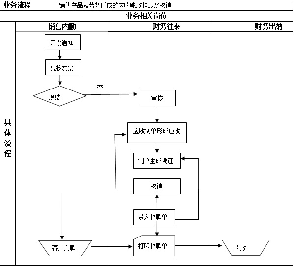 1、 銷售助理根據客戶要求在【銷售管理】模塊中開具開票通知單,確認無誤后在【銷售管理】模塊對開票通知單進行復核。 2、 財務往來會計在【應收賬款】模塊檢查銷售助理傳遞來的開票通知單,進行審核,生成應收憑證。 借:應收賬款 貸:產品銷售收入—xxxx產品 應交稅金-應交增值稅-銷項稅金 3、 銷售人員向客戶催收貨款,客戶貨款劃到到公司后,財務往來會計在【應收賬款】模塊中錄入收款單,進行核銷客戶應收賬款,生成核銷憑證。 收款單進行制單: 核銷制單: 借:銀行存款 借:預收賬款 貸: 應收賬款(預收賬款) 貸: 應收賬款 財務收納員打印收款單,業務員或客戶進行簽字確認,出納出進行入賬,登記現金日記賬和銀行日記賬。 |